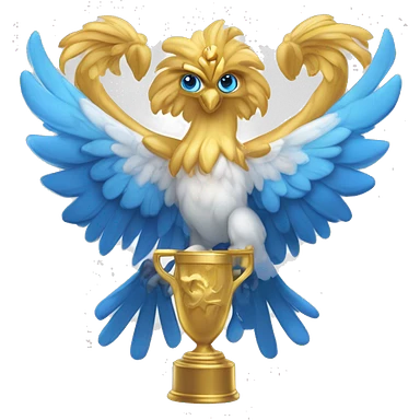 Un griffon blanc de la mythologie avec un bec bleu et des cheveux bleus et des yeux dorés qui porte un trophée emoji