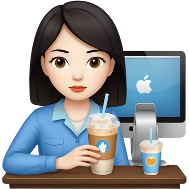컴퓨터하면서 아이스 아메리카노(테이크아웃 잔에 담긴)를 많이 마시고 있는 다크서클 검은머리 여자 emoji