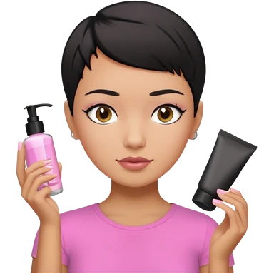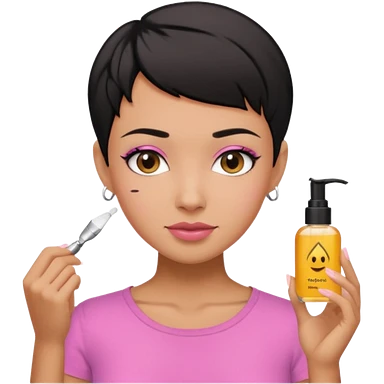 tan girl with no makeup pink shirt with black hair & a pixie, cut no earrings, doing pastel colors skin care emoji