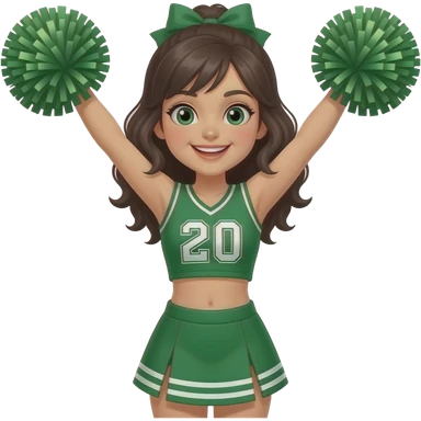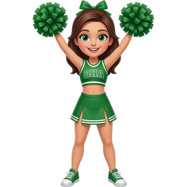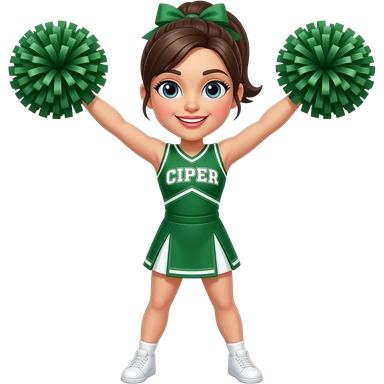 African-American girl, jumping up, happily holding two cheer pom-poms while wearing a green cheerleading outfit that reads pack in the center of the cheer uniform  emoji