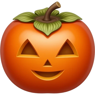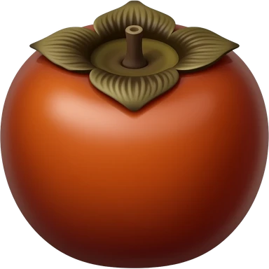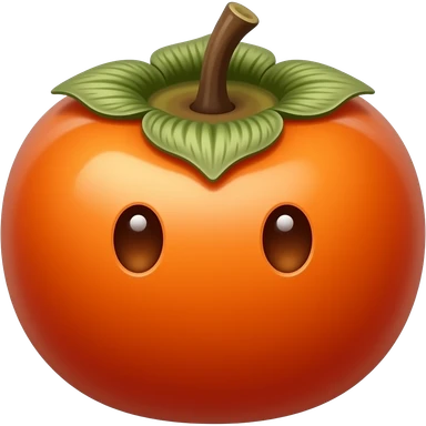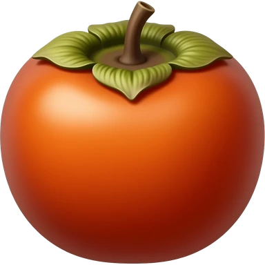 whole persimmon fruit with smooth glossy orange skin, flattened round shape, green leafy calyx on top with soft folds and natural texture, slightly dimpled surface suggesting ripeness and firmness, no leaf cut or extras, soft lighting, subtle shadows, emoji scale emoji