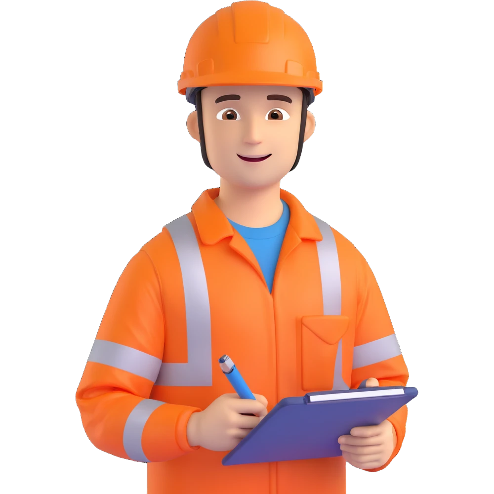 cheerful man in orange safety gear and helmet, holding a clipboard, with a welcoming expression emoji | AI Emoji Generator