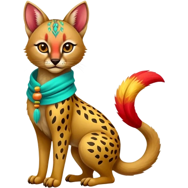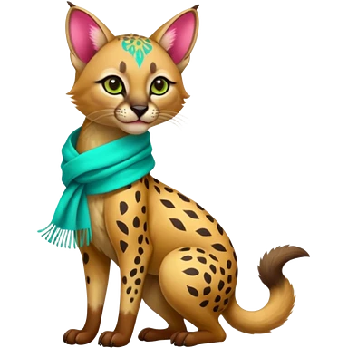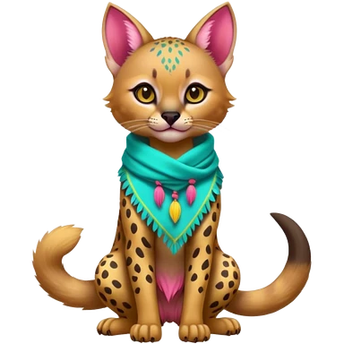 Colorful cute adorable tropical exotic fruity kiwi-green lemony rosy neon-red Caracal-Cheetah-Civet-Trico-fusion-hybrid-animal-creature, full body, with tribal tattoos, wearing a yellow-and-cyan scarf emoji