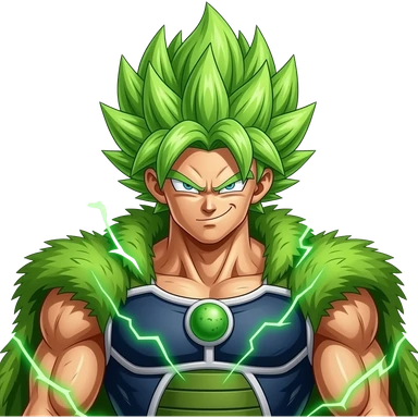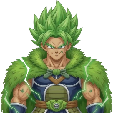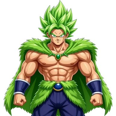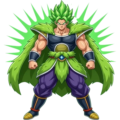 Un broly super poderoso y musculoso con capa peluda y verde y el pelo de un verde florescente y rayos verdes al alrededor emoji
