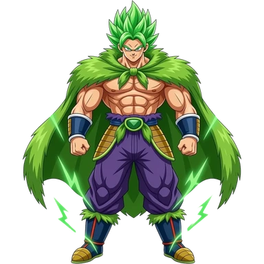 Un broly super poderoso y musculoso con capa peluda y verde con cuerpo entero y el pelo de un verde florescente y rayos verdes al alrededor emoji