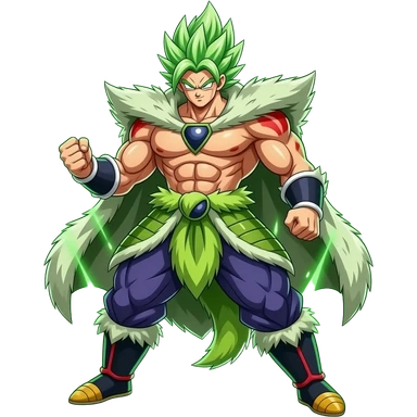 Un broly super poderoso y musculoso con capa peluda un aura grande y pose de pelea y verde con cuerpo entero y el pelo de un verde florescente y rayos verdes al alrededor emoji