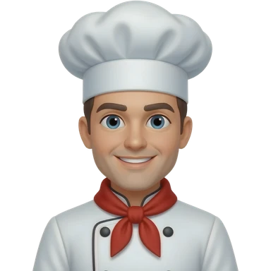 Middle aged male pastry chef - with a small beard, apron, white hat, holding an egg beater in his right hand, and his left hand naturally hanging down to his side emoji