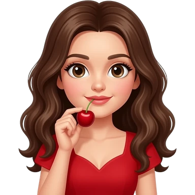 Brown haired woman with and big eyes in a red dress holding cherries. emoji