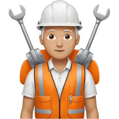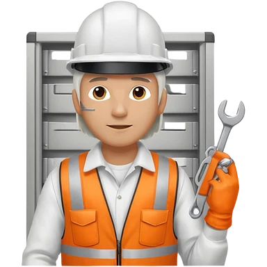 Guy with white head protection with ear noise canceller and orange vest With spanner. On his side carrying side panels for the white server racks emoji