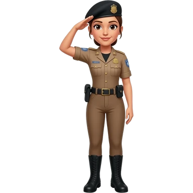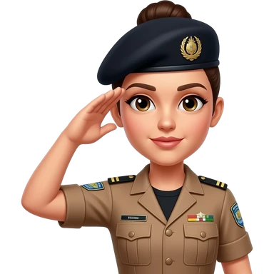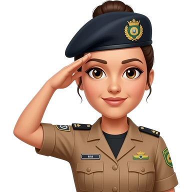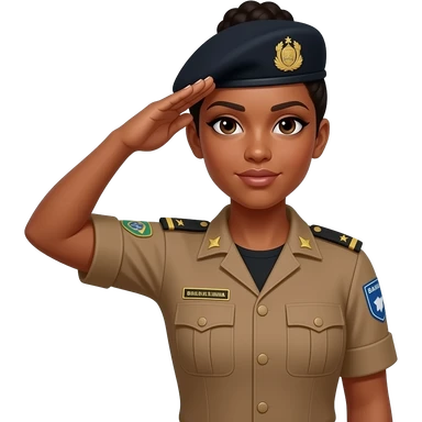 Sargento Gianne Policial militar da bahia feminina morena com cabelo amarrado no coque boina preta e farda marrom e camisa preta por dentro da farda sem enfeites na farda prestando continência emoji