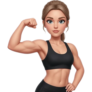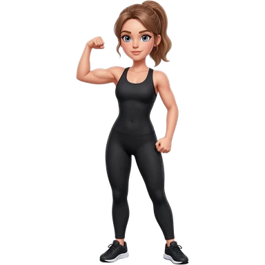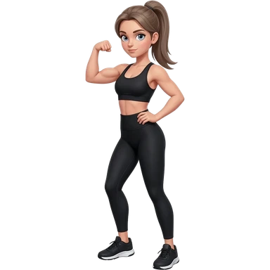 flexing bicep with confident workout pose, fair-skinned woman, gray-blue eyes, ash brown brows, ash light brown hair tied back, slim athletic body, black workout set, black sneakers with white soles emoji