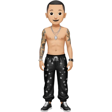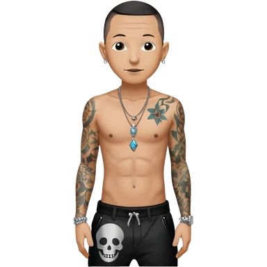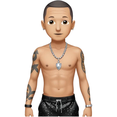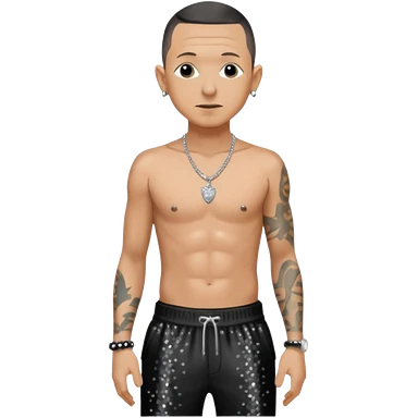 Chester Bennington with black sequin baggy pants, shirtless with necklace emoji