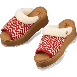 Chestnut colored low cut slip-on slippers. thin red woven zig-zag trim on the cuff, a red heel pull tab, and a thick platform sole. “UGG” emoji | AI Emoji Generator