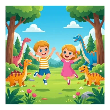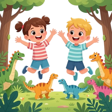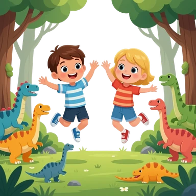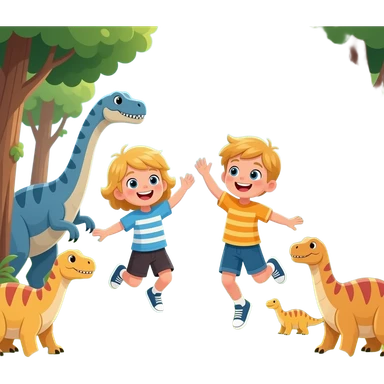 igual pero amb cabell rubio els dos nens, estan saltant en un bosc erroific ple de dinosaures emoji