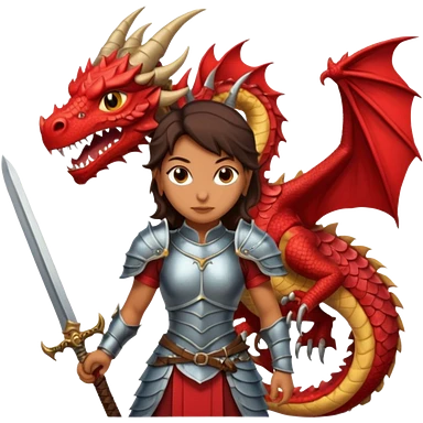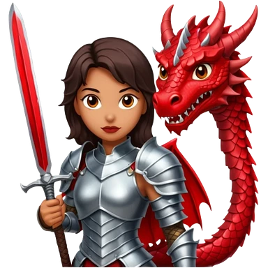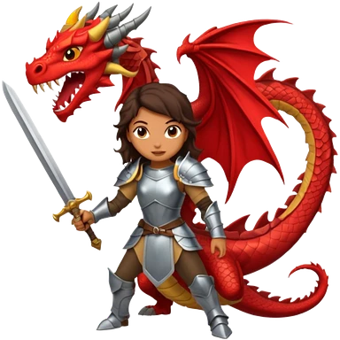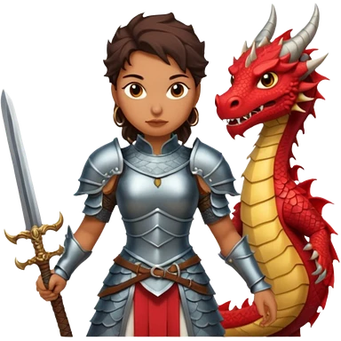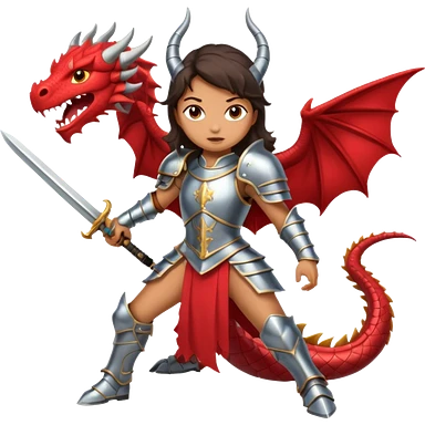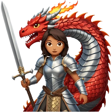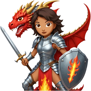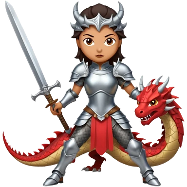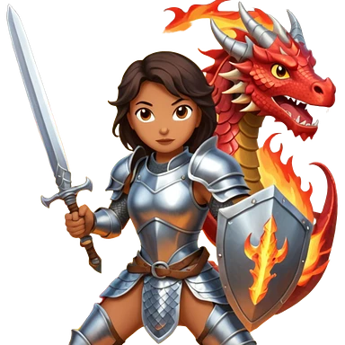 Fierce Latina in armor with a sword in a losing battle with a dragon emoji