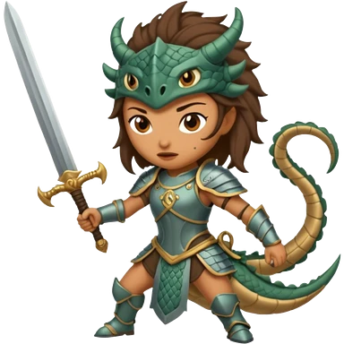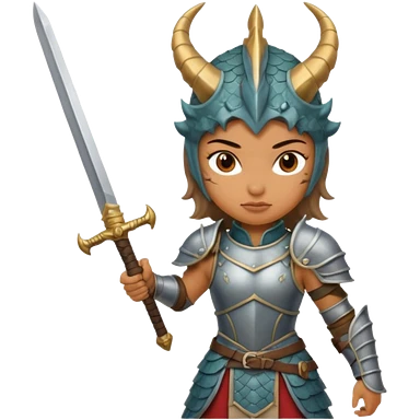 Fierce Latina in armor with a sword cutting off the head of a dragon emoji