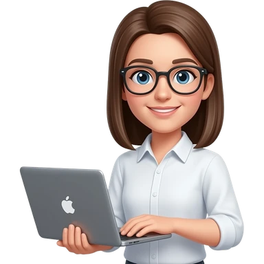 chica de ojos verdes con pelo marrón largo y algo ondulado, usando una camisa blanca y unos anteojos para leer con marco negro, mientras sostiene una macbook y tiene un café emoji