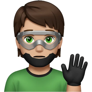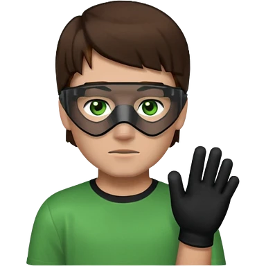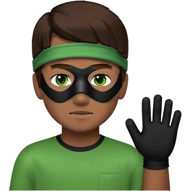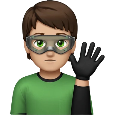 Chico de pelo marrón, ojos verdes y la mitad de la cara color gris ceniza. Con un cubre bocas negro, que tiene una camisa verde por encima de una remera blanca, y tiene un guante negro en una sola de las manos. Estilo minecraft emoji