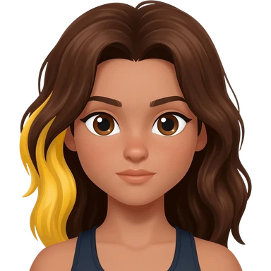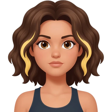 Una chica de piel clara/oscura de ojos marrones pelo castaño ondulado con mechas rubias una en el lado izquierdo debajo de una capa de pelo y la otra detras y tiene un cuerpo de atleta emoji