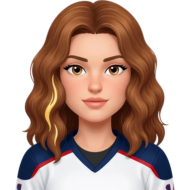 Una chica jugadora de hockey pelo castaño ondulado con mechas rubias una en el lado izquierdo debajo de una capa de pelo y la otra detras y tiene un cuerpo de atleta emoji