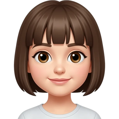 Una niña piel blanquita rellenita con fleco cabello corto y color castaño ojos color cafes emoji
