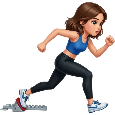 Una chica morena con el pelo 5cm más de los hombros q este corriendo de una salida de los tacos de atletismo y q vaya primera y la equipacion top azul y pantalones negros de joma emoji