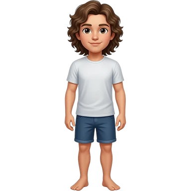 Hazme con el cuerpo entero de pie un chico con pelo rizado largo hacia abajo, ojos marrones, boca y nariz mediana. Bajito de constitución un poco fuerte un poco bronceado, camiseta y pantalon corto emoji