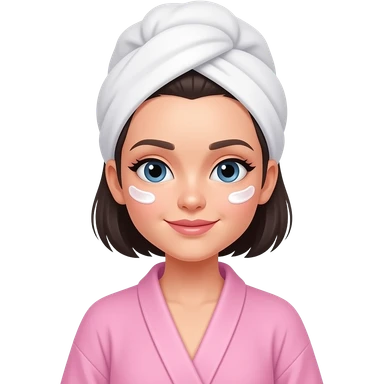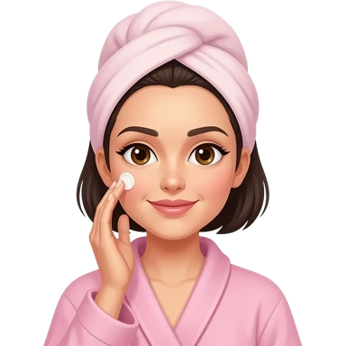 chica de cabello oscuro y corto, con ojos color cafe, con bata de salir del baño color rosa, con la toalla en la cabeza y aplicándose una crema en la cara emoji