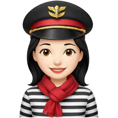 marinera de pelo negro piel blanca con camisa a rayas blanco y negro y pañuelo rojo y gorra de capitana y sonrisa de china emoji