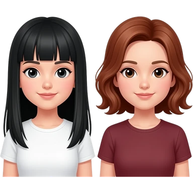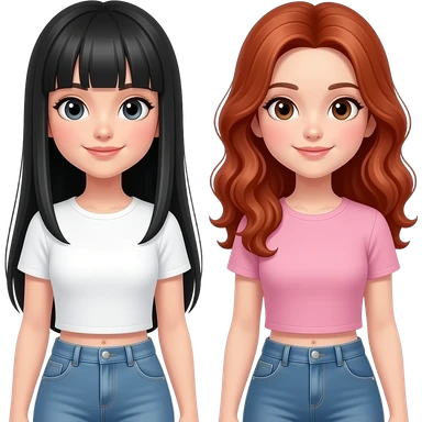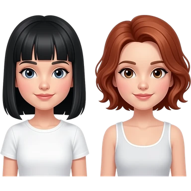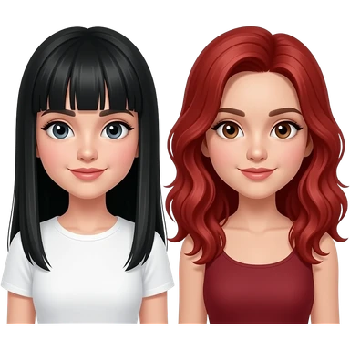 Una de las chicas en blanca, con el pelo negro lacio largo y con flequillo recto, la otra chica es un poquito morena, con ondas marcadas y el pelo muy muy rojo abajo de los hombros, que estén de cuerpo completo emoji