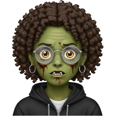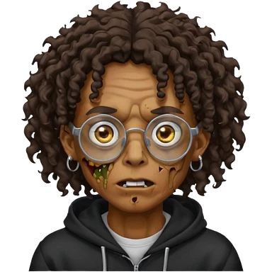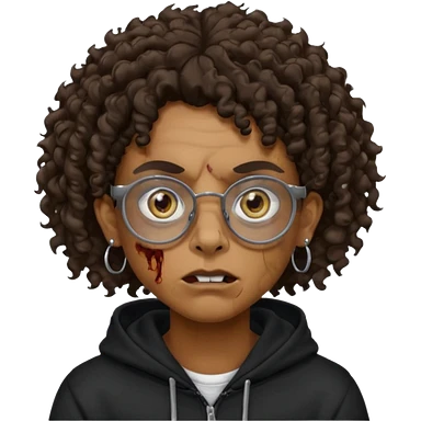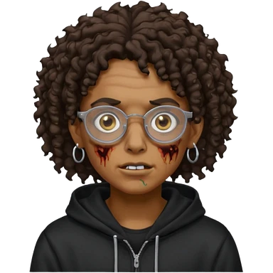 Chico moreno zombie, con gafas y sudadera negra, dos aretes en la oreja izquierda y dos en la derecha, ojeras en los ojos, pelo rizado emoji