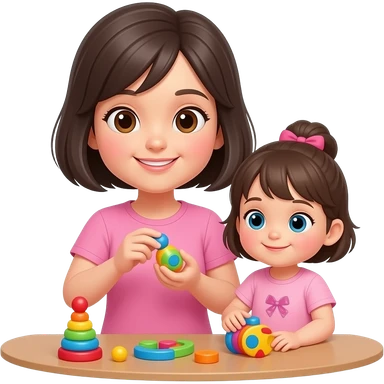 chica de cabello oscuro y corto, sin accesorios, ojos cafes y ropa rosa, jugando con con juguetes con su hija pequeña en casa emoji