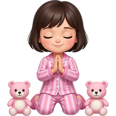 chica de cabello oscuro y corto sin accesorios, con ojos color cafe, con una pijama color rosa con rayas y una pantuflas de osito rosa, de rodillas orando con los ojos cerrados, sin peluches alrededor emoji