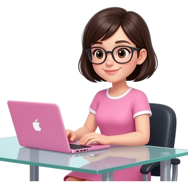 chica de cabello oscuro y corto, con ojos color cafe y gafas de lectura, con vestido color rosa, sentada en un escritorio de vidrio, con una laptop iphone color rosa, viendo graficos del mercado de valores emoji