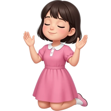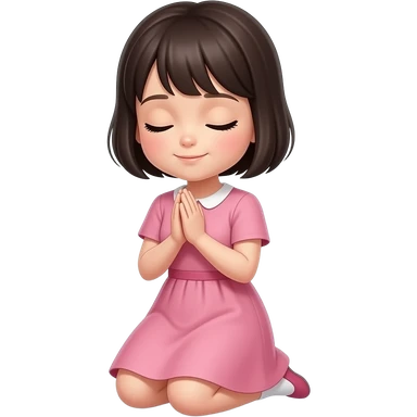 chica de cabello oscuro y corto, sin accesorios, con vestido color rosa, orando de rodillas, con ojos cerrados emoji