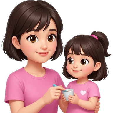 chica de cabello oscuro y corto, sin accesorios, ojos cafes y ropa rosa, jugando con su hija pequeña en casa emoji