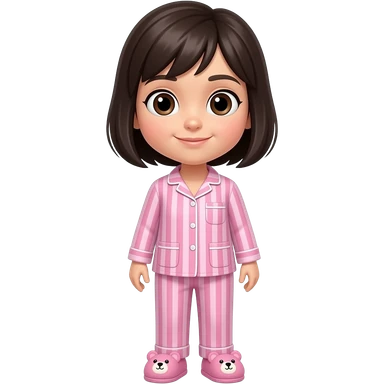 chica de cabello oscuro y corto sin accesorios, con ojos color cafe, con una pijama color rosa con rayas y una pantuflas de osito rosa emoji