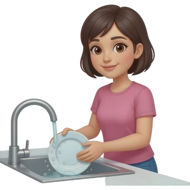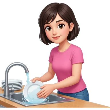 chica de cabello oscuro y corto sin accesorios, con ojos color cafe, con camiseta solida color rosa, lavando los platos emoji