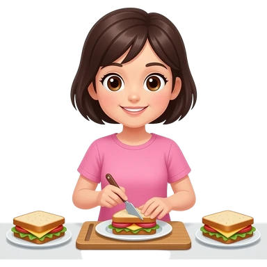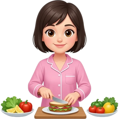 chica de cabello oscuro y corto, con ojos color cafe, con ropa comoda color rosa, preparando la cena un sándwich emoji