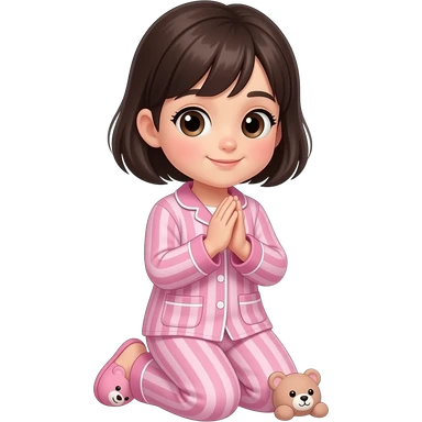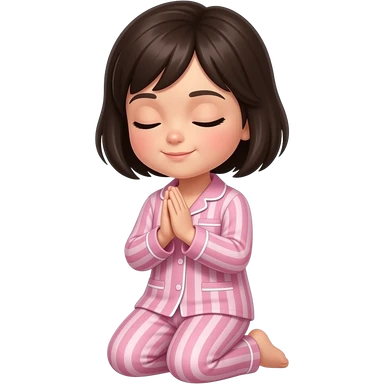 chica de cabello oscuro y corto sin accesorios, con ojos color cafe, con una pijama color rosa con rayas, de rodillas orando con los ojos cerrados emoji