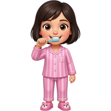 chica de cabello oscuro y corto sin accesorios, con ojos color cafe, con una pijama color rosa con rayas y una pantuflas de osito rosa, cepillandose los dientes emoji