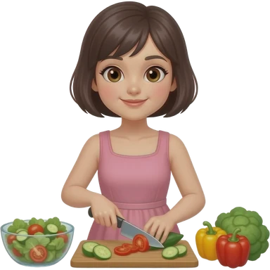 chica de cabello oscuro y corto, con ojos color cafe, con vestido color rosa, haciendo el almuerzo una ensalada de vegetales emoji
