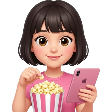 chica de cabello oscuro y corto, con ojos color cafe, con ropa color rosa, con palomitas de maiz y mirando una tablet de iphone rosa en la otra mano emoji