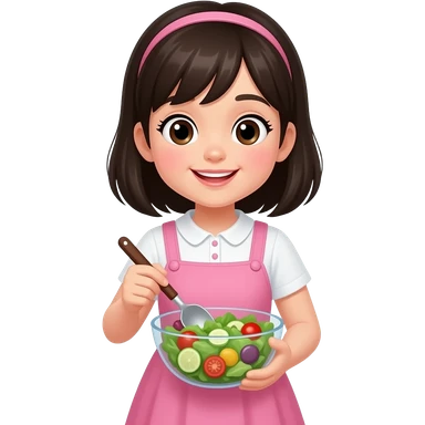 chica de cabello oscuro y corto, sin accesorios, con vestido color rosa, cocinando una ensalada emoji