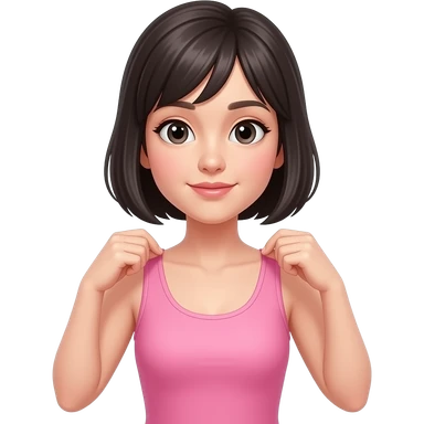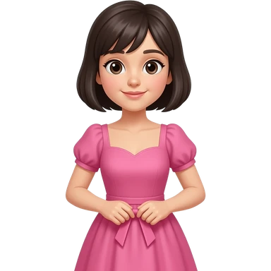 chica de cabello oscuro y corto, sin accesorios, colocandose con un vestido rosa, en su cuarto emoji