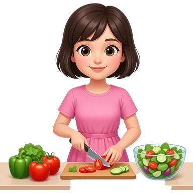 chica de cabello oscuro y corto, sin accesorios, con vestido color rosa, picando vegetales para una ensalada en la cocina emoji