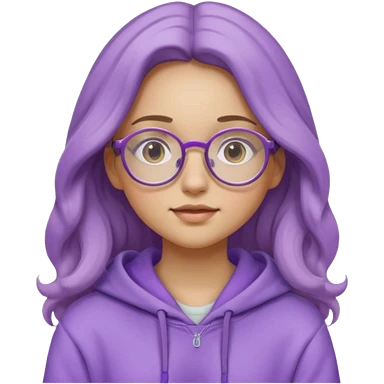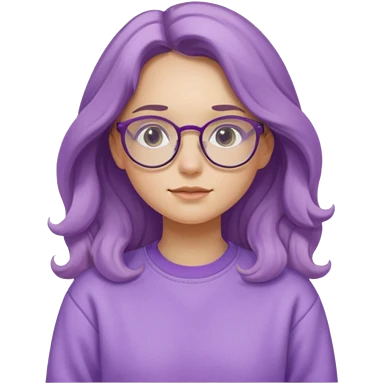 Chica de pelo largo y ondulado, con gafas redondas y expresión suave; viste una sudadera lila y transmite un estilo tranquilo y relajado. emoji | AI Emoji Generator