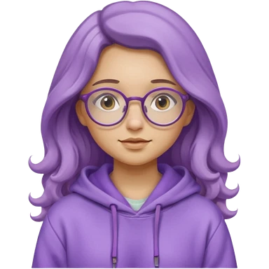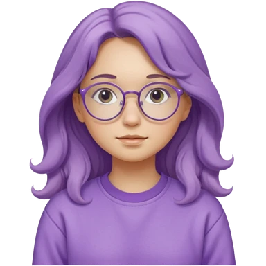 Chica de pelo largo y ondulado, con gafas redondas y expresión suave; viste una sudadera lila y transmite un estilo tranquilo y relajado.emoji