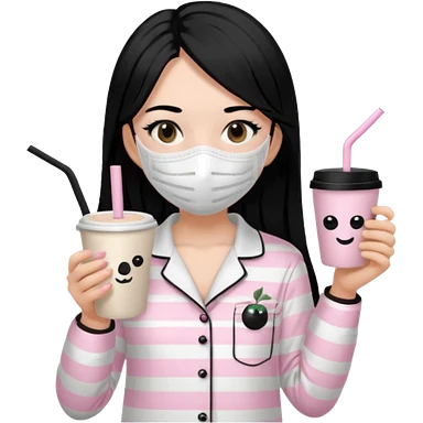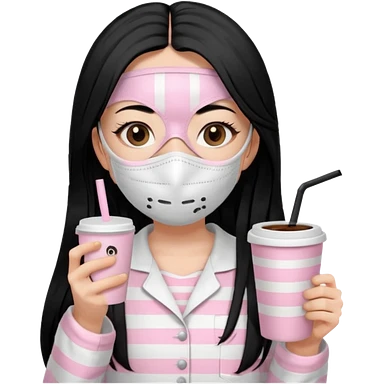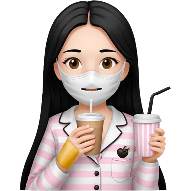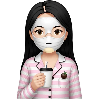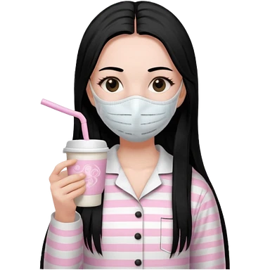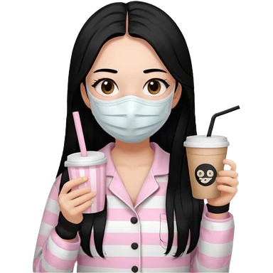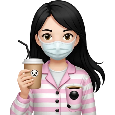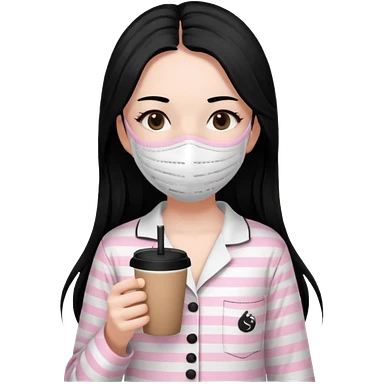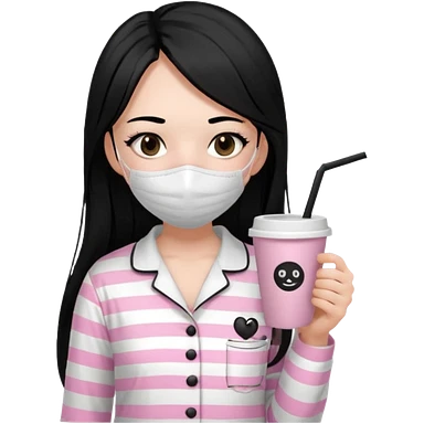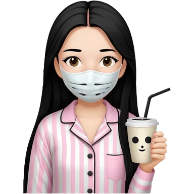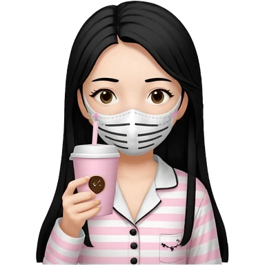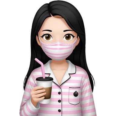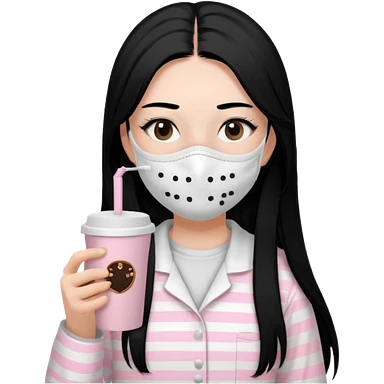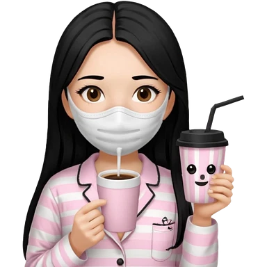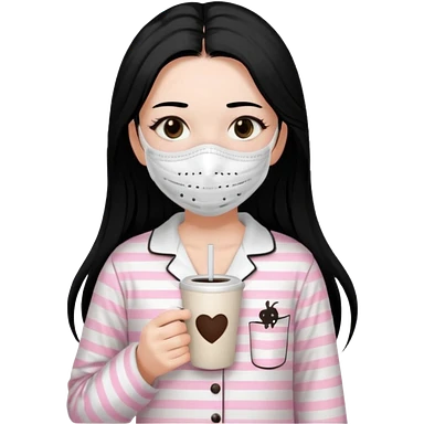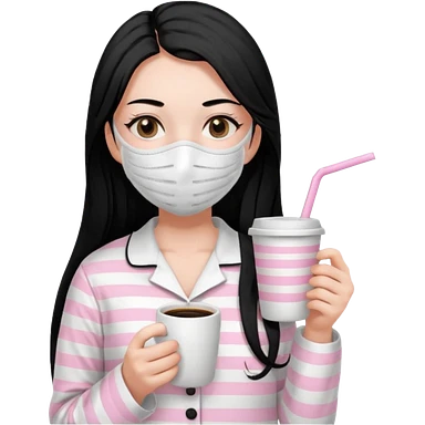 chica de pelo lacio color negro cabellera larga piyama blanca con rayas rosa claras peo no tan claras no oscuras el bordado es negro al igual que los botones )tiene una mascarilla para la carablanca y sostiene y cafe con bolitas nedras al dondo con unsorbete tranparente y es de test blanca emoji