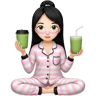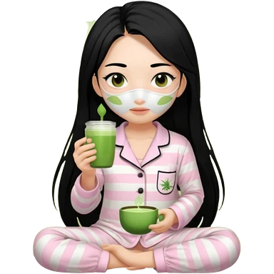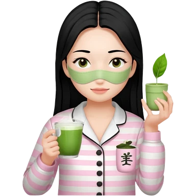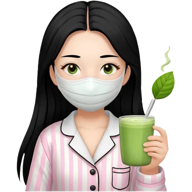 chica de pelo lacio color negro cabellera larga piyama blanca con rayas rosa claras peo no tan claras no oscuras el bordado es negro al igual que los botones )tiene una mascarilla para la cara una mascarilla faciial blanca y sostiene un matcha y es de test blanca emoji